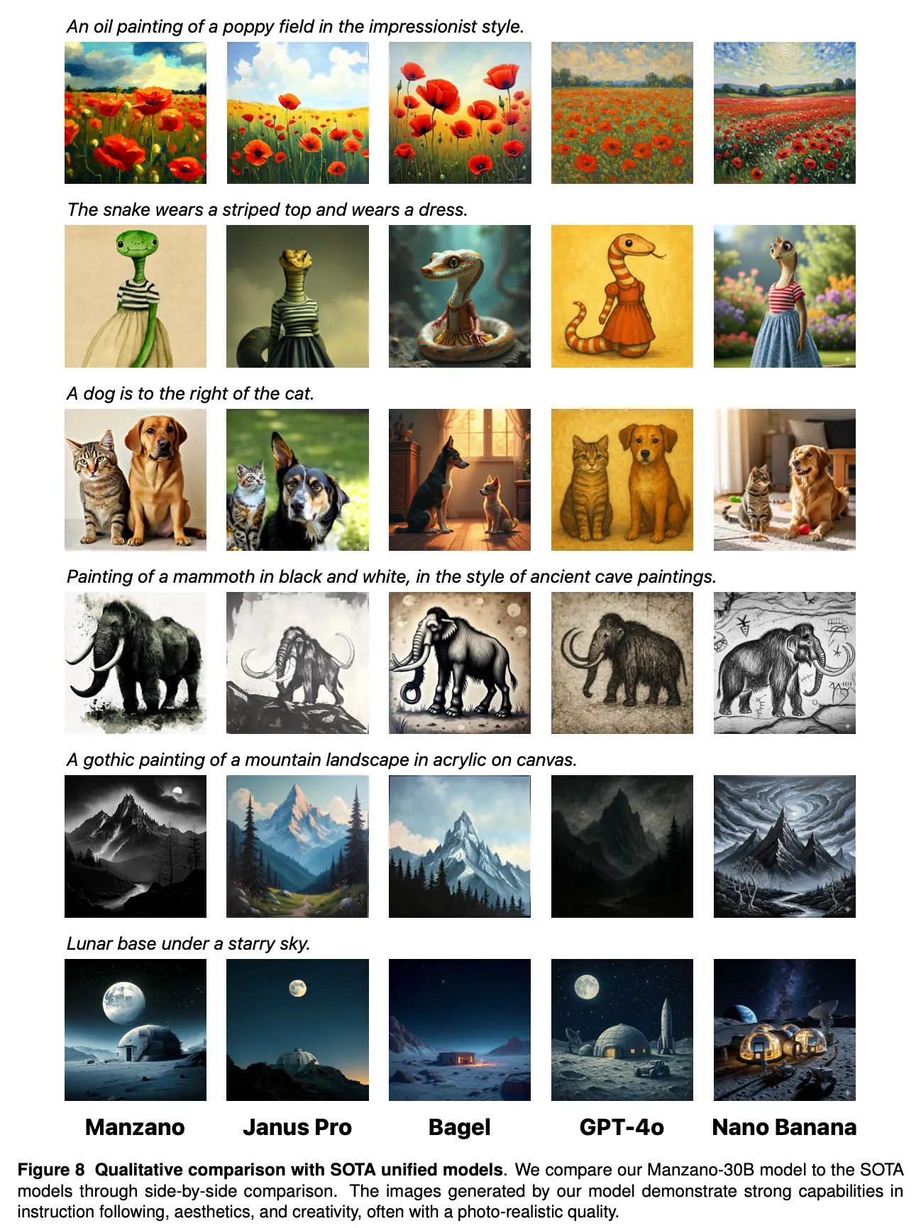 Un confronto con modelli come GPT-4o e Nano Banana conferma la competitività di Manzano in più metriche chiave.