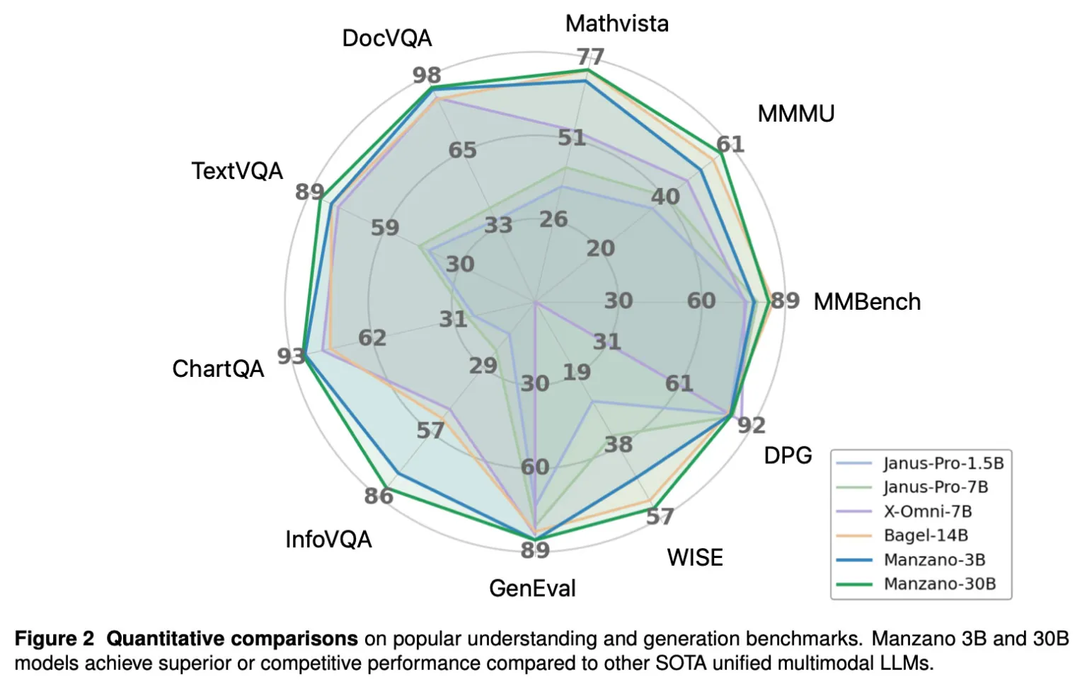 Nei test, i modelli Manzano 3B e 30B hanno mostrato performance superiori o competitive rispetto ad altri modelli multimodali unificati all’avanguardia.