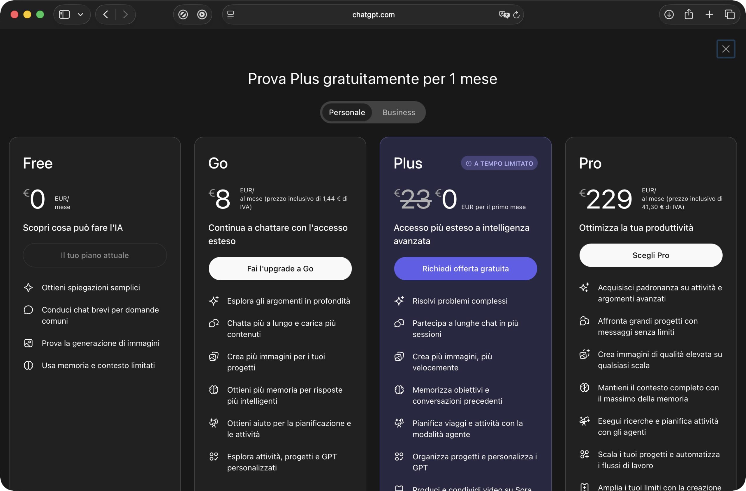 Con questo lancio, ChatGPT si articola ora su tre livelli a pagamento, oltre alla versione gratuita: Go, Plus e Pro, con un ventaglio di prezzi che va dagli 8 ai 200 euro mensili.