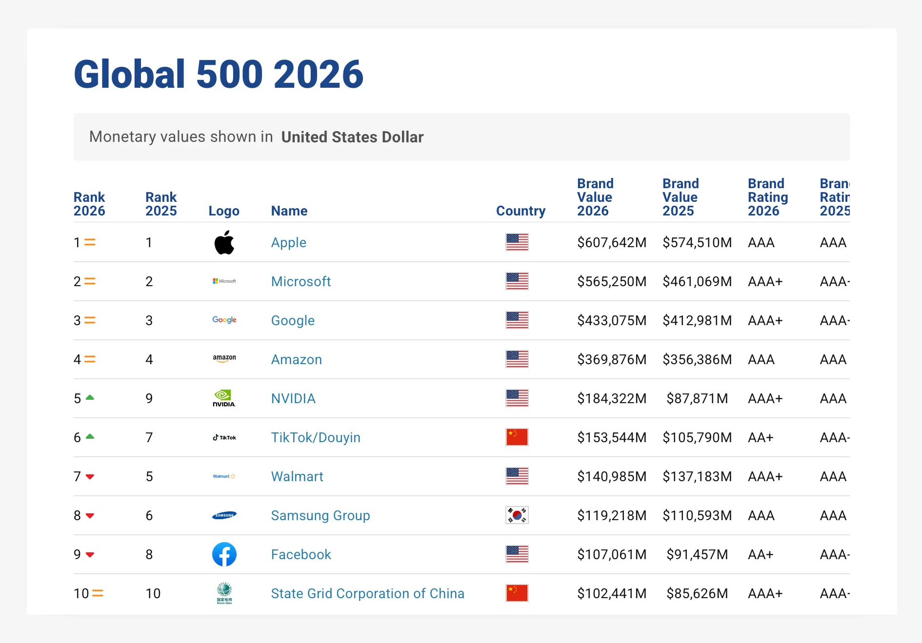 Nell’edizione più recente, Apple, Microsoft, Google, Amazon, NVIDIA e TikTok/Douyin occupano le prime sette posizioni. Insieme, questi marchi raggiungono un valore complessivo di circa 2.310 miliardi di dollari, con una crescita del 15,8% su base annua.