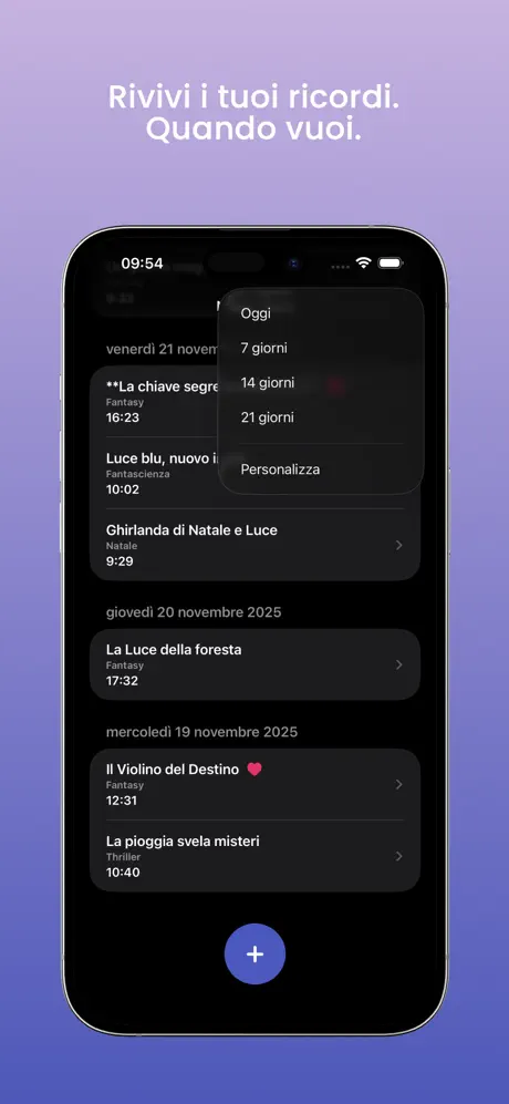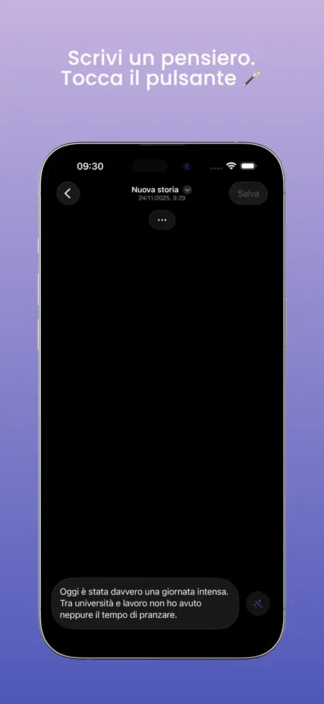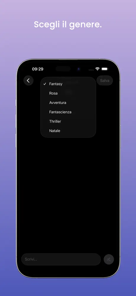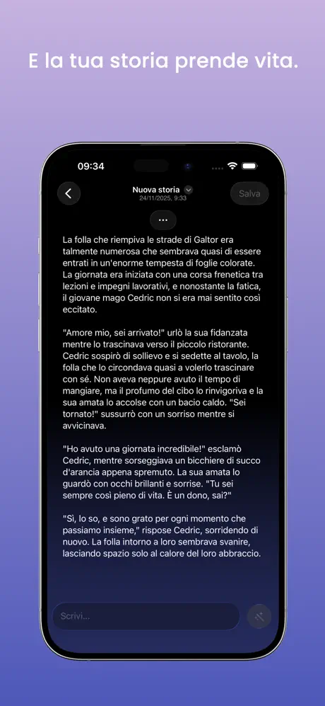 Creare una nuova pagina è semplicissimo. Si sceglie il genere narrativo, si scrive un pensiero — anche breve — e Magic Diary fa il resto. L’AI rielabora il testo, lo arricchisce, lo trasforma in una storia ispirata alle emozioni di quel momento.
