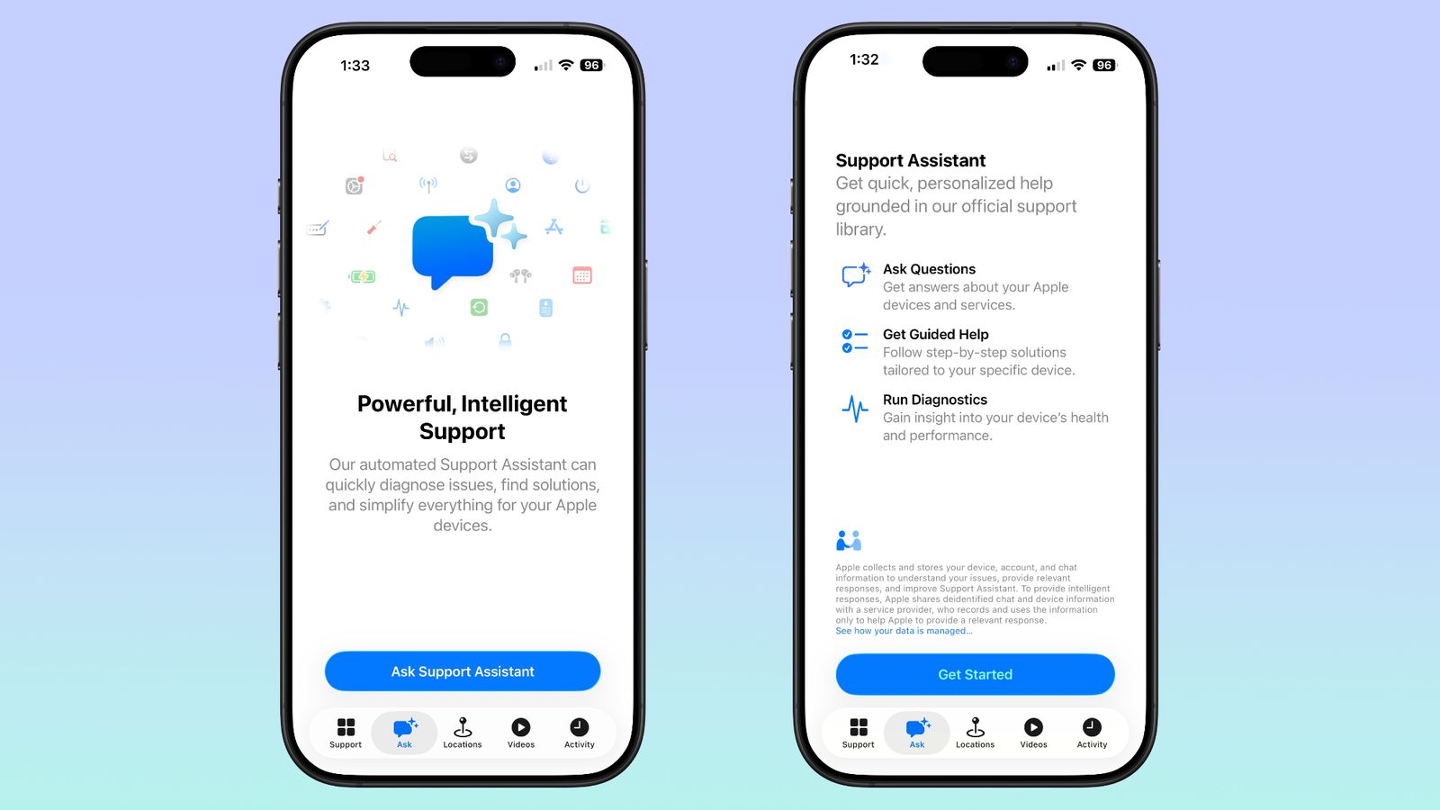 Oltre a rispondere alle domande su dispositivi e servizi Apple e a fornire supporto personalizzato in base al dispositivo dell’utente, la società afferma che l’assistente è ora in grado di aiutare a eseguire operazioni di diagnostica. In questo modo può mostrare informazioni sullo stato di salute e sulle prestazioni di un dispositivo.