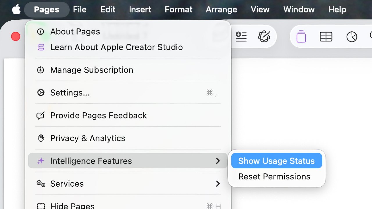 Per chi utilizza Apple Creator Studio, Apple consente di verificare lo stato del proprio utilizzo direttamente dalle app Pages, Numbers o Keynote. Su Mac, è sufficiente aprire il menu dell’app, accedere alla sezione delle funzioni di intelligenza artificiale e selezionare la voce per visualizzare lo stato di utilizzo. Su iPhone e iPad, la stessa opzione è disponibile nel menu “Altro”.