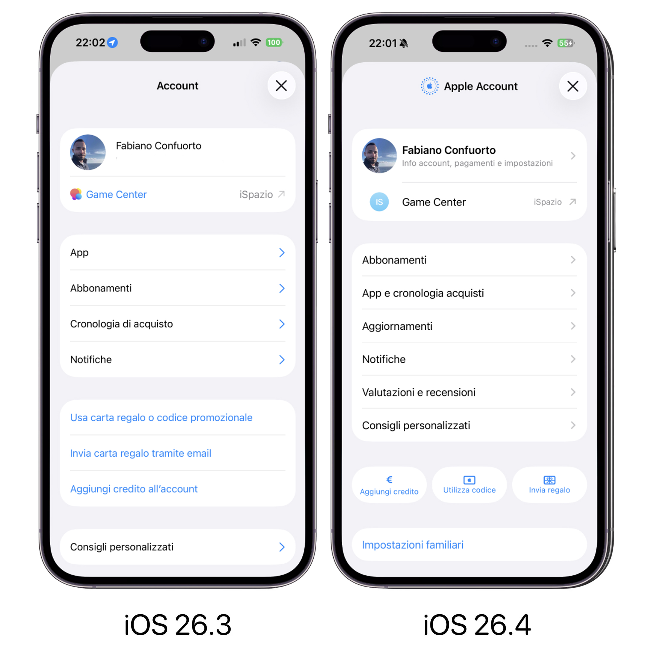 iOS 26.4 beta 1 ridisegna anche la pagina Apple Account che appare quando si tocca il proprio avatar su App Store, Apple Music, Apple TV e Apple Podcasts.