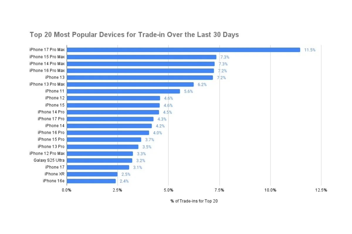 iPhone 17 Pro Max rappresenta oggi l’11,5% di tutti gli smartphone permutati, una quota in costante crescita rispetto al 5,1% registrato a novembre 2025, al 7,7% di gennaio 2026 e al 9,5% rilevato alla fine dello scorso mese.