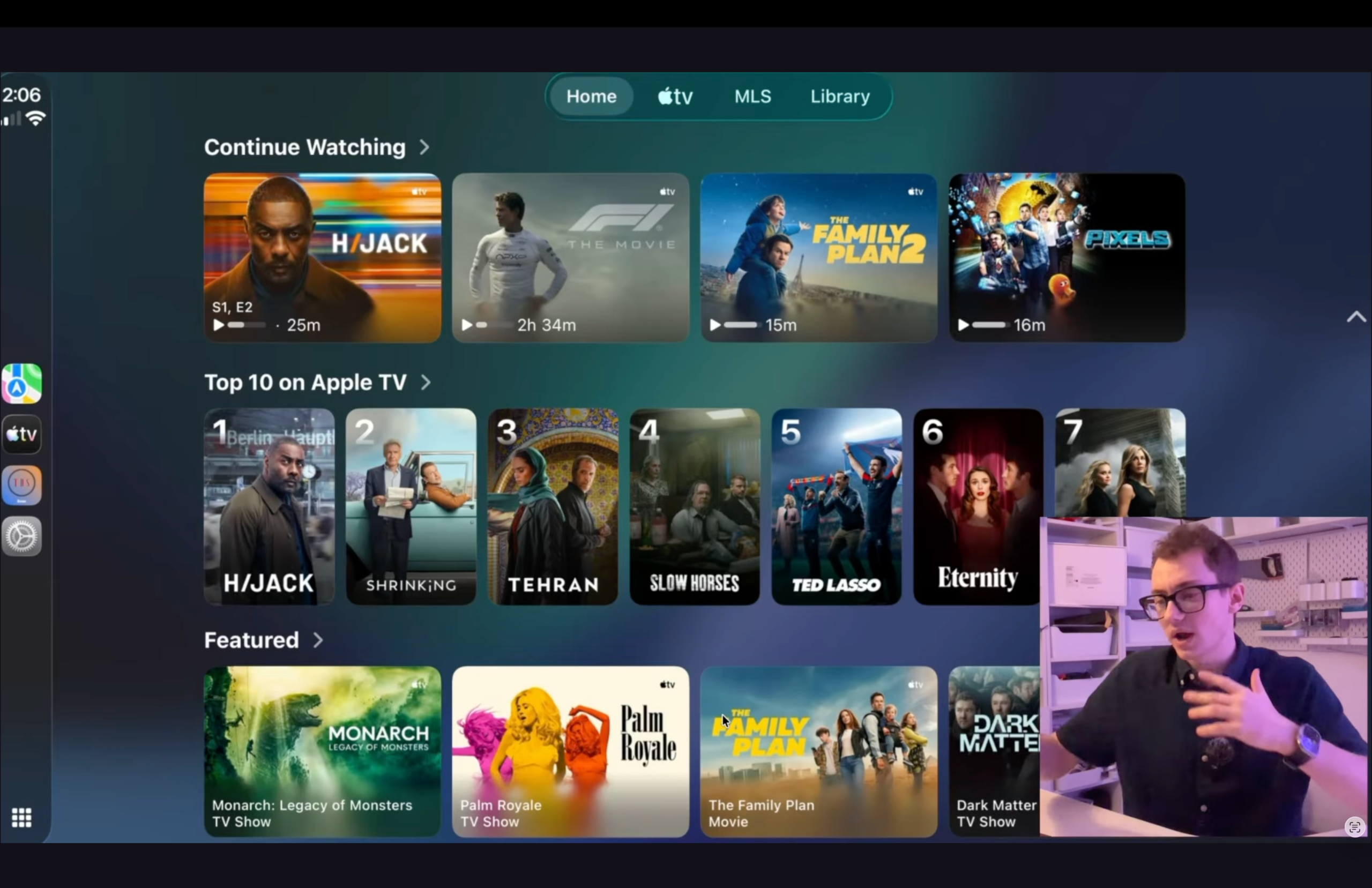 Nel simulatore compare anche un’app Apple TV dedicata a CarPlay. L’interfaccia consente di accedere ai contenuti del servizio di streaming, alla propria libreria personale e persino a una sezione dedicata a MLS Season Pass.