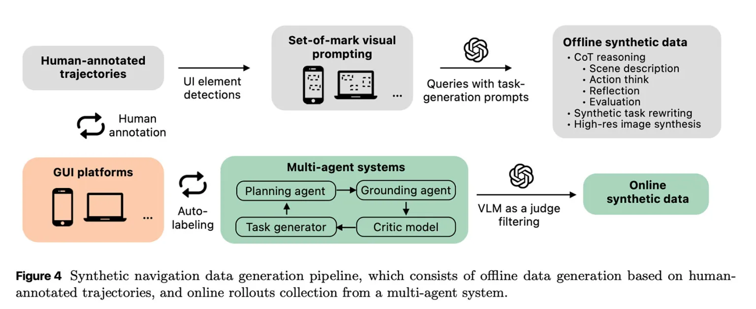 Un altro contributo rilevante riguarda la generazione autonoma dei dati di training. I ricercatori hanno sviluppato un sistema multi-agente che interagisce direttamente con piattaforme GUI reali per produrre esempi sintetici su larga scala. Un generatore di task propone obiettivi di difficoltà crescente, un agente di pianificazione li suddivide in passaggi, un agente di grounding li esegue sullo schermo e un modello critico valuta i risultati.