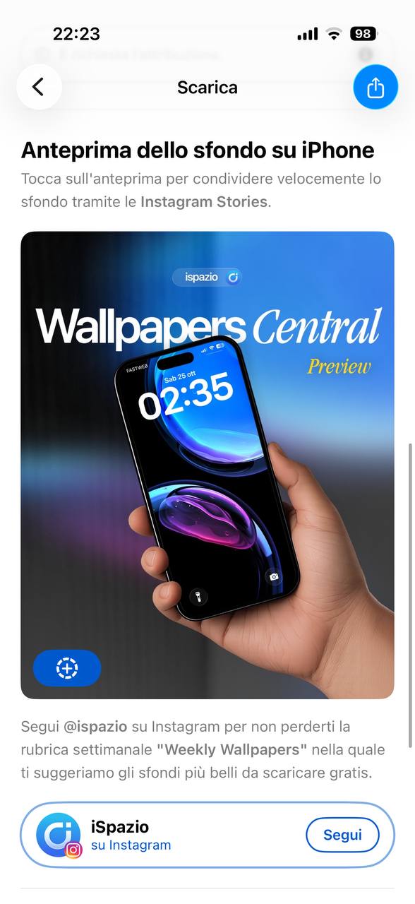 - La pagina Download è stata potenziata per accogliere le anteprime video e per mostrare una preview di come apparirà lo sfondo su iPhone. Toccando l’immagine potrete condividere immediatamente lo sfondo su Instagram tramite le Storie. Queste sono le stesse immagini che mostriamo da un pò di tempo sul sito web e che utilizziamo per la rubrica Weekly Wallpapers che svolgiamo già da 3 settimane sul nostro account instagram @ispazio che vi invitiamo a seguire per non perdervi la nostra selezione di sfondi, ogni settimana.