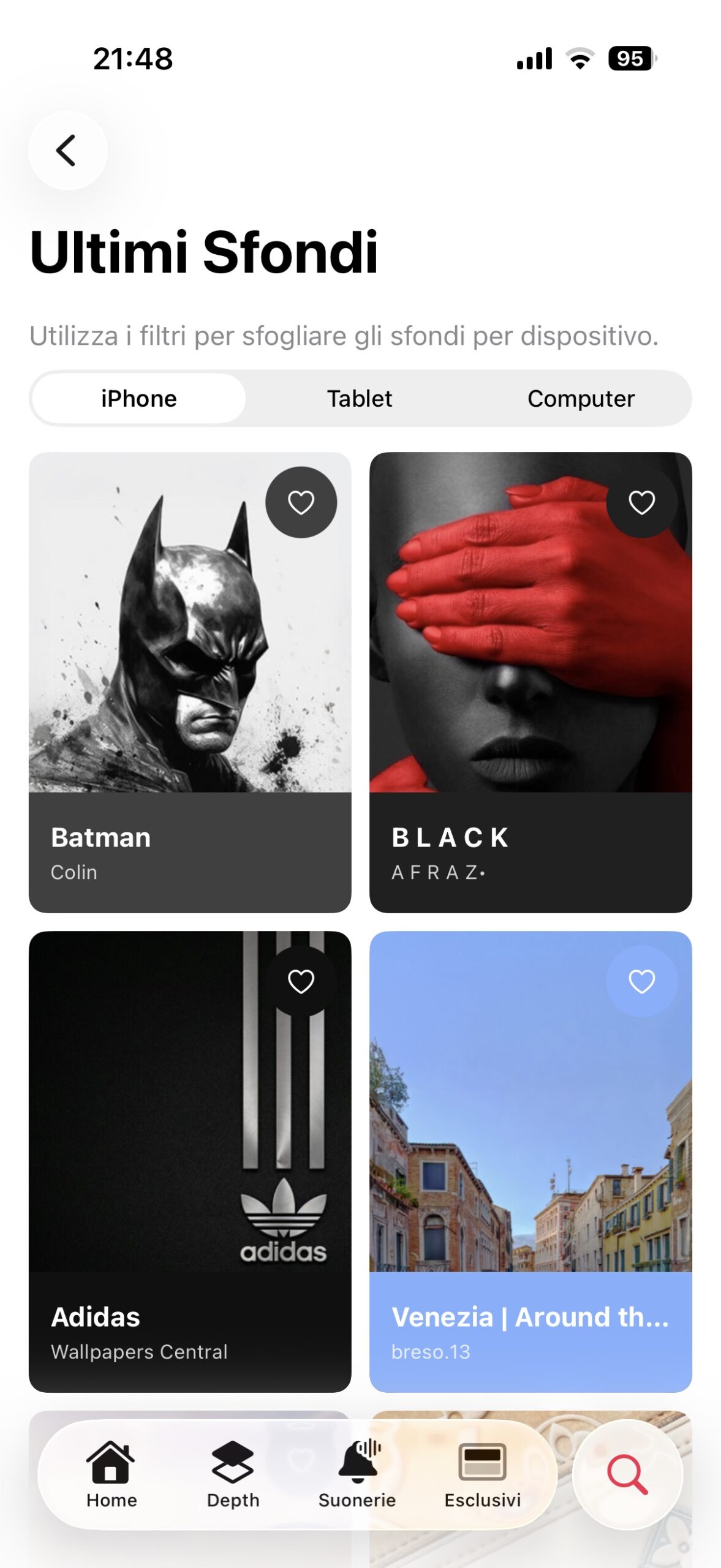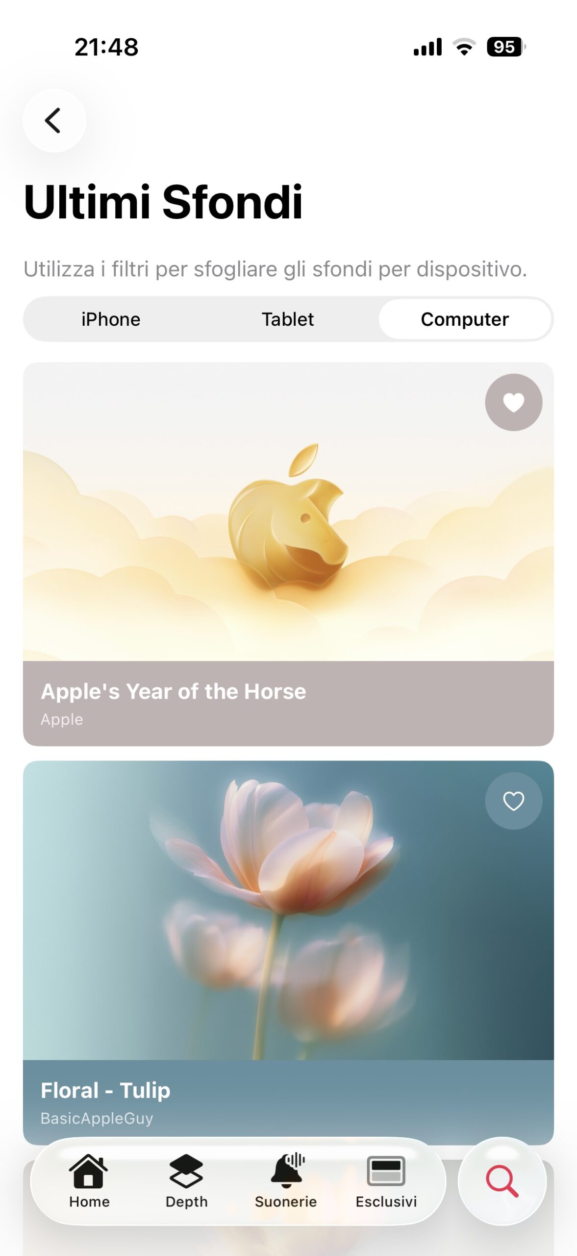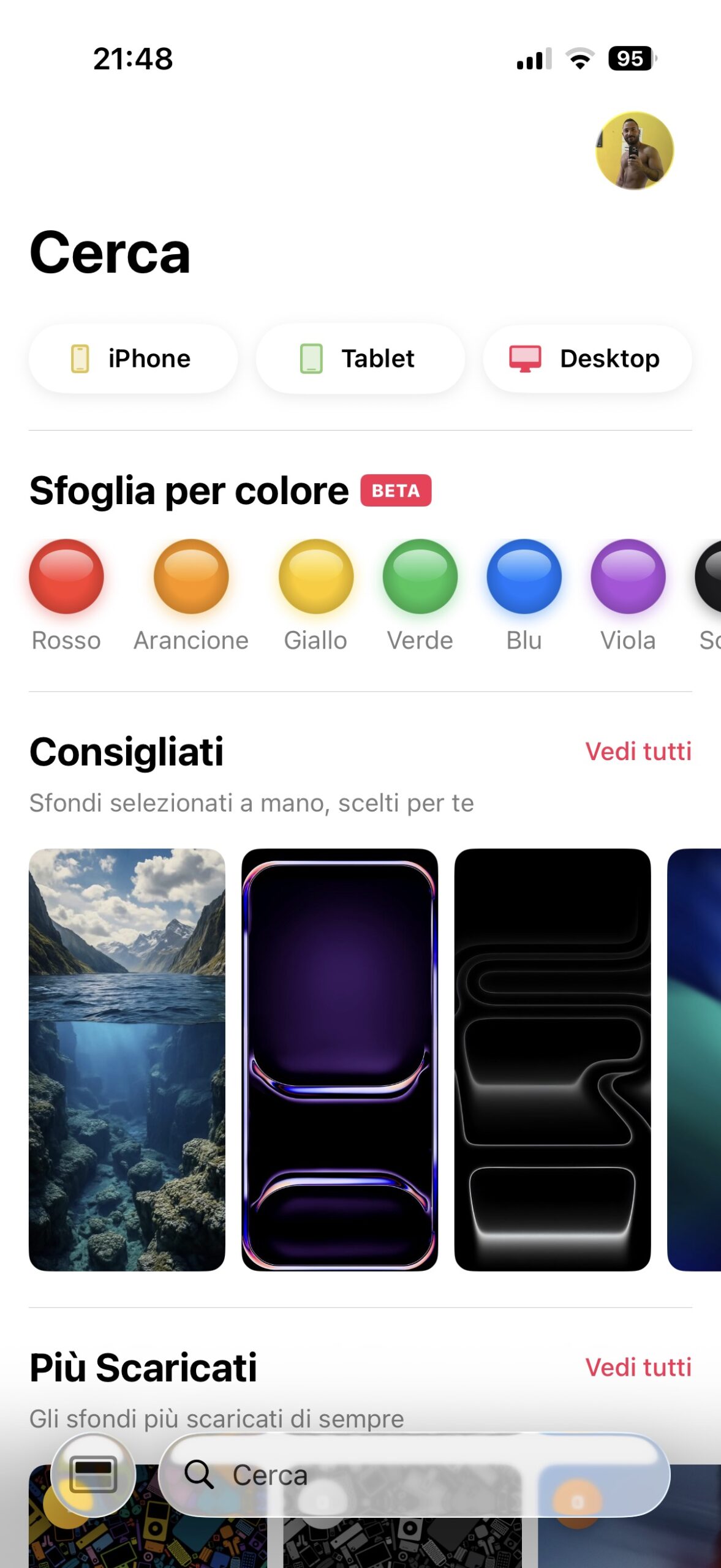 E’ quasi tutto nuovo nella sezione “Cerca”: Si inizia da un nuovo filtro per dispositivo che mostrerà soltanto gli sfondi compatibili con iPhone, quelli fatti per iPad e quelli per il computer. Gli sfondi tablet vengono mostrati in anteprima quadrata e quelli desktop in anteprima landscape, per rendere le cose ancora più chiare.
