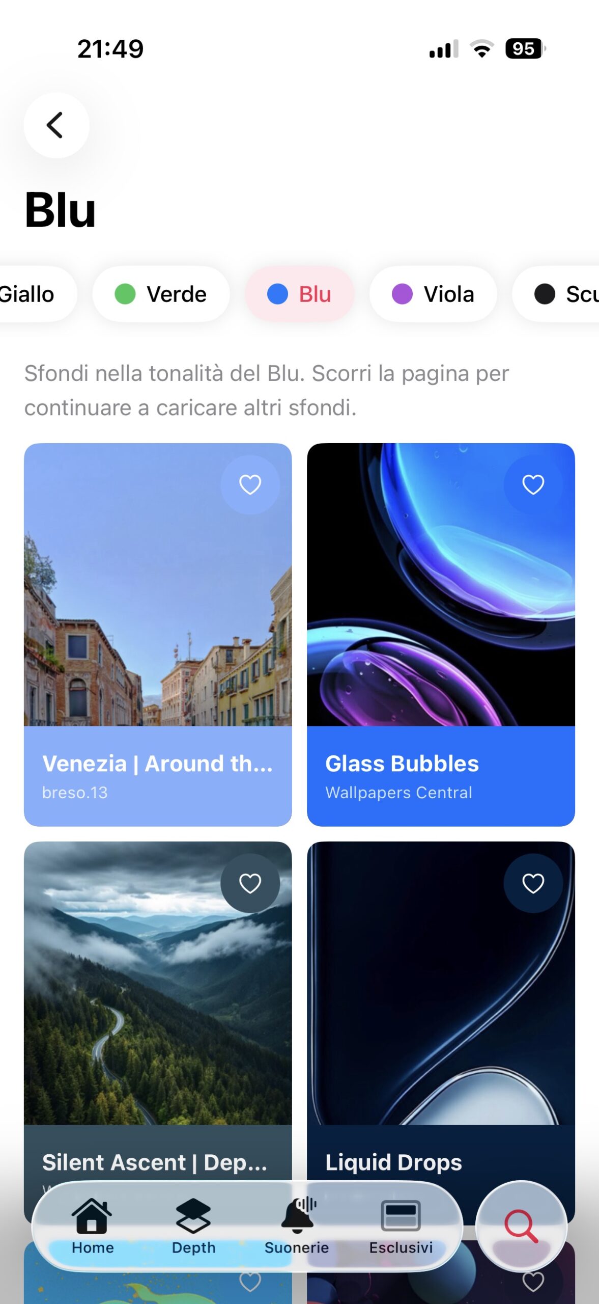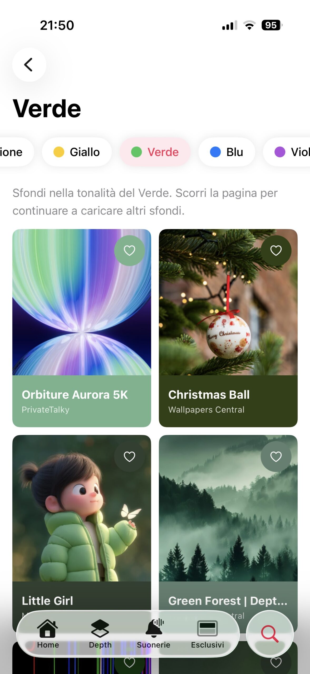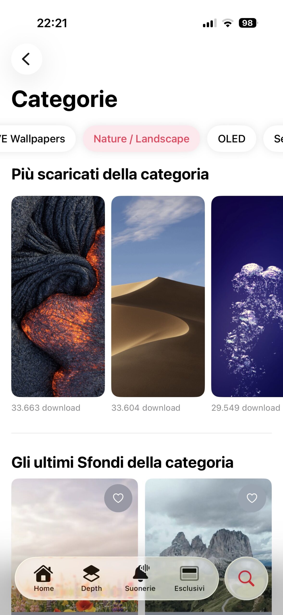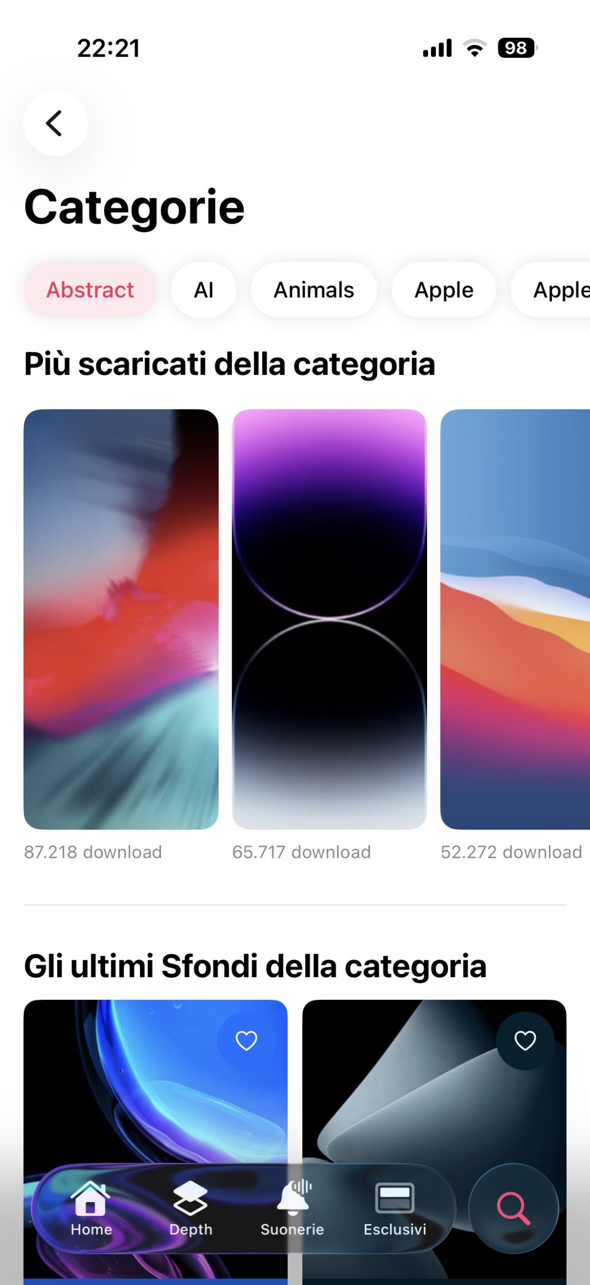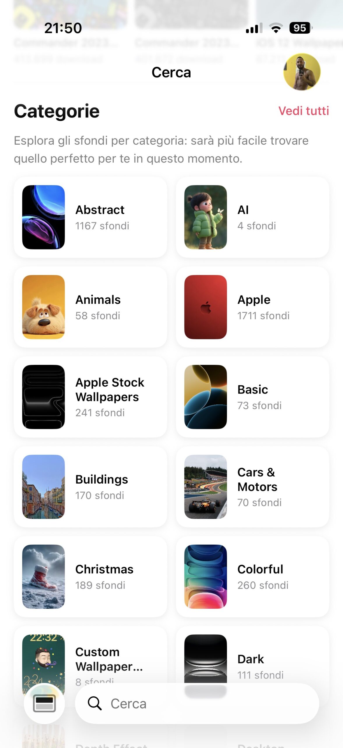 Le categorie sono state completamente ridisegnate: oltre al nuovo layout, ognuna mostra l’anteprima dell’ultimo sfondo pubblicato all’interno della stessa. Il caricamento è molto più fluido con placeholder shimmer in tutte le sezioni.