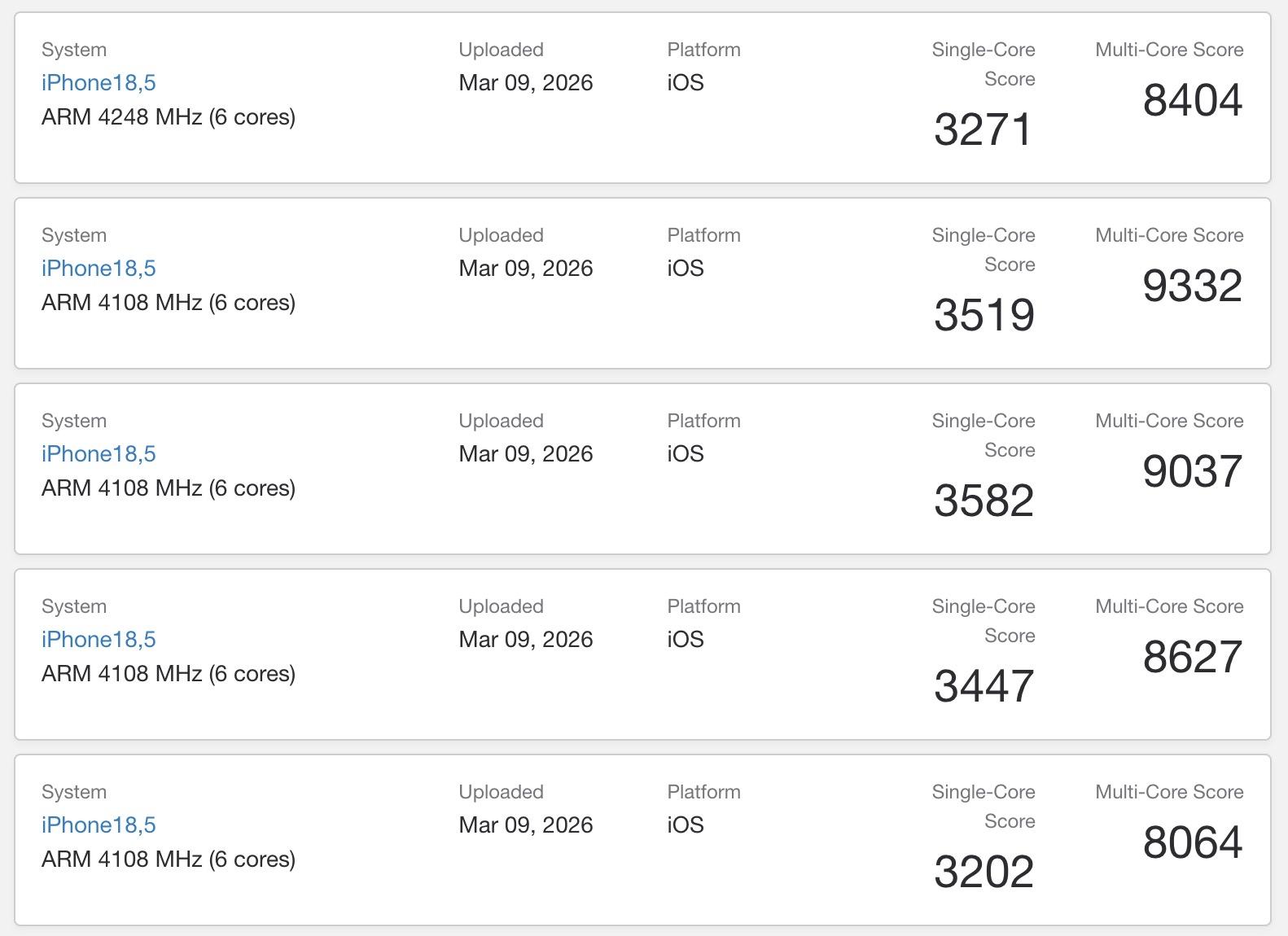 Al momento sono stati individuati undici risultati attribuiti al chip A19 dell’iPhone 17e. Analizzando la media dei test, il dispositivo ottiene circa 3.320 punti nel test single-core e 8.373 punti nel test multi-core.