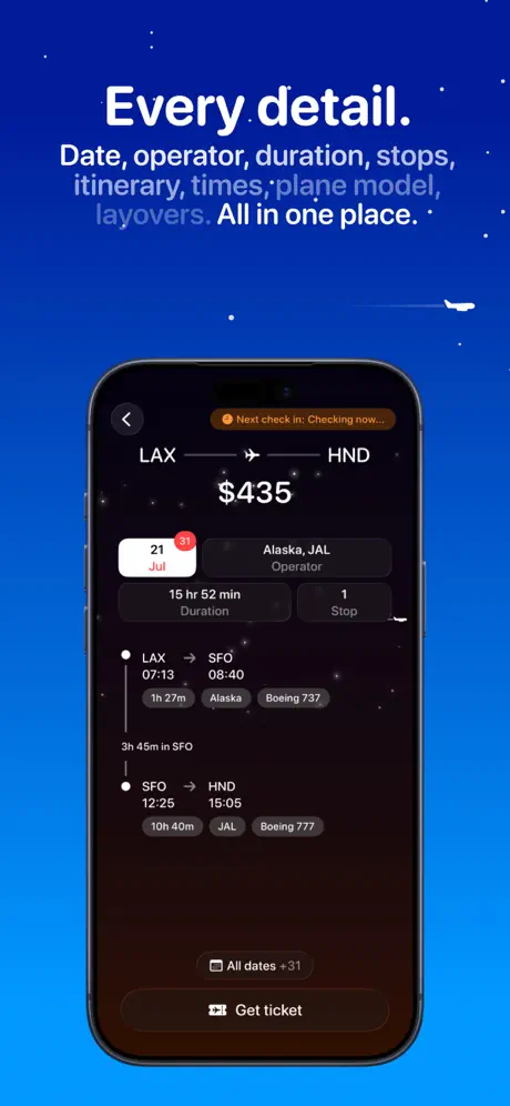 Non manca una schermata dettagliata con tutte le informazioni sul volo, comprese compagnie aeree, orari, scali, durata del viaggio e perfino il tipo di aeromobile, con accesso rapido alla prenotazione. Il tutto in un’app senza pubblicità, ben curata graficamente e pensata per chi viaggia spesso.