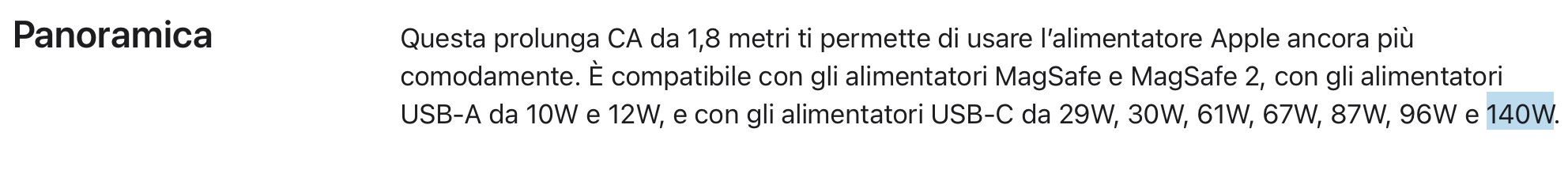 Curiosamente, la pagina prodotto ufficiale di Apple dedicata al cavo di prolunga indica che l’accessorio è compatibile con gli alimentatori USB-C da 140W, nonostante le segnalazioni degli utenti evidenzino il contrario.