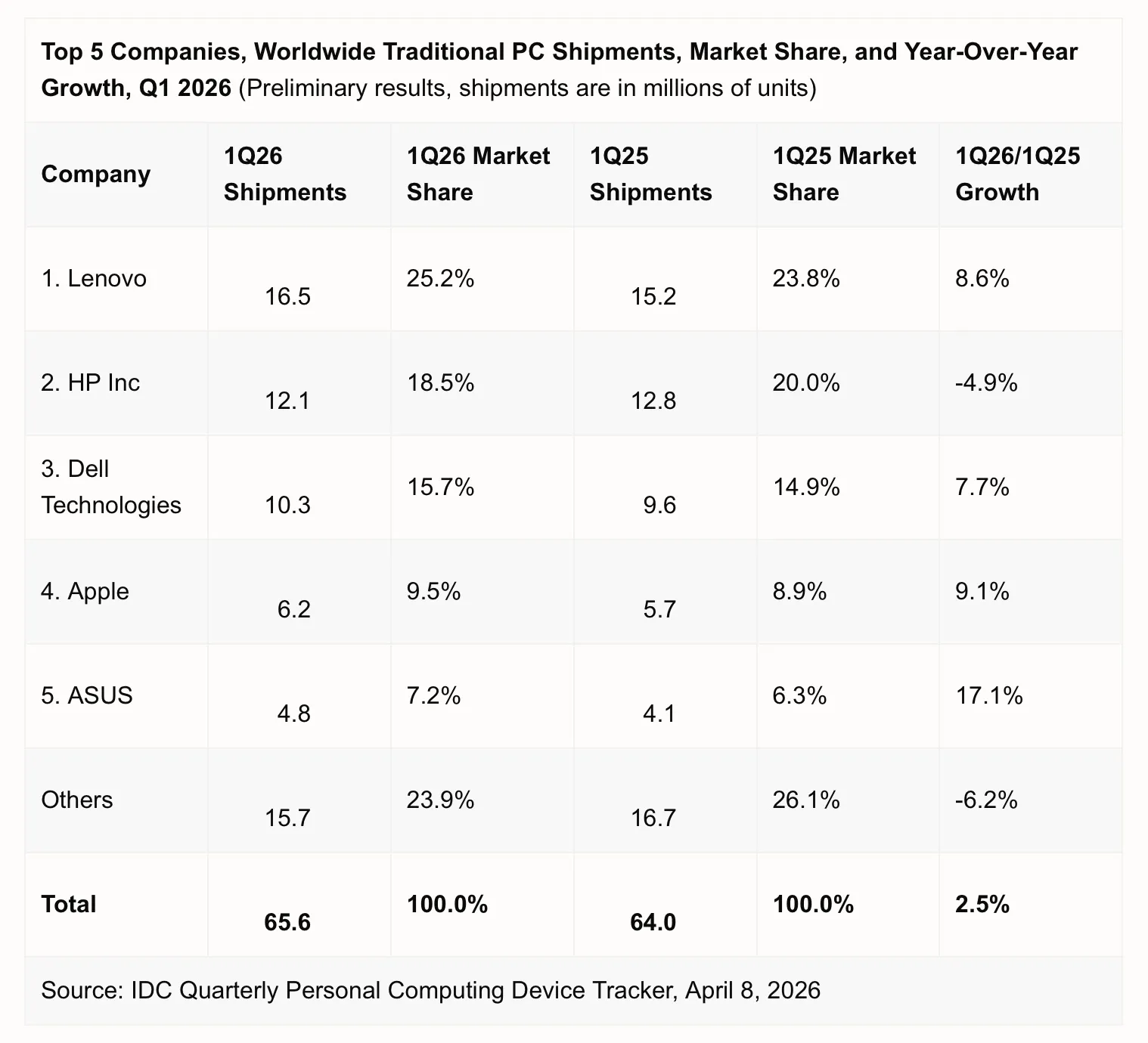 Secondo l’ultimo rapporto pubblicato da IDC, la società di Cupertino ha spedito 6,2 milioni di Mac nel primo trimestre del 2026, un dato che si traduce in un incremento del 9,1% rispetto allo stesso periodo dell’anno precedente e che porta la sua quota di mercato al 9,5%.