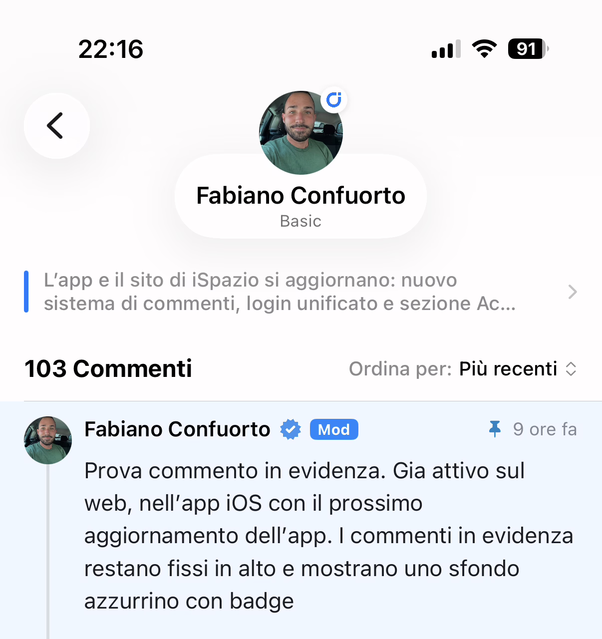 – Commenti in evidenza (Pin): gli amministratori possono mettere un commento in evidenza. Il commento pinnato resta sempre in cima alla lista indipendentemente dall’ordinamento scelto, con uno sfondo azzurrino e un’icona pin accanto alla data. Funziona sia sul sito web che nell’app. Utilizzeremo questi commenti per mettere in evidenza una soluzione ad un problema o per far leggere a più persone possibili un determinato messaggio importante.