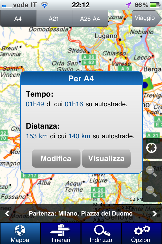 Una volta avviata l’applicazione, viene visualizzata la classica mappa che siamo abituati a vedere nel sito internet di ViaMichelin.it. Ciò che contraddistingue questa versione mobile sono i tabs “user friendly” posti nel lato basso della schermata: