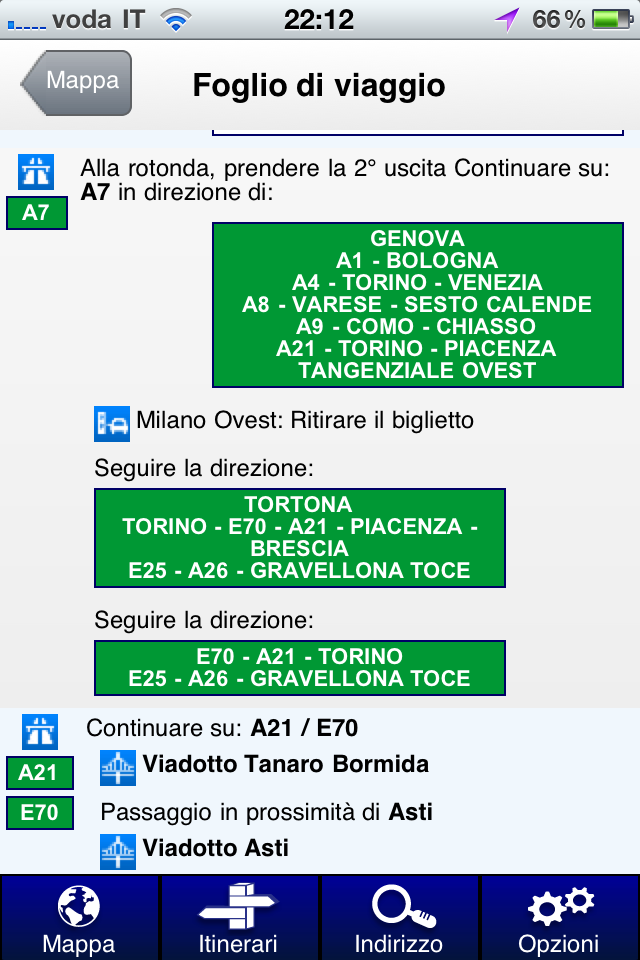 Una volta che abbiamo deciso il percorso migliore per le nostre esigenze, cliccando sul tab viaggio, viene visualizzata la consueta tabella di marcia con varie informazioni e cartelli con i colori relativi al tipo di strada che dobbiamo utilizzare.