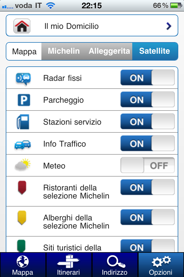 L’ultimo tab invece è dedicato alle opzioni per personalizzare il nostro calcolatore di itinerari. Nonostante quasi tutti i navigatori, gratis o a pagamento, turn by turn e non, presenti in App Store siano equipaggiati con numerosi settaggi, primo fra tutti i PDI, ViaMichelin Mobile dà la possibilità di visualizzare pochi punti di interesse quali: