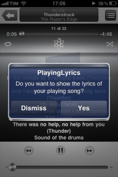 Installando questo nuovo tweak potrete aggiungere una funzione all’applicazione per l’ascolto della musica presente sul vostro iDevice. Infatti in seguito all’installazione potrete mostrare i lyrics della canzone in ascolto attraverso delle gesture Activator. PlayingLyrics non andrà a creare una nuova sezione in Impostazioni ma dovrete assegnare questa funzione attraverso quella già presente di Activator. Una volta eseguita la gesture apparirà un messaggio che ci chiederà se vorremo vedere il testo della canzone e successivamente una nuova apposita finestra.