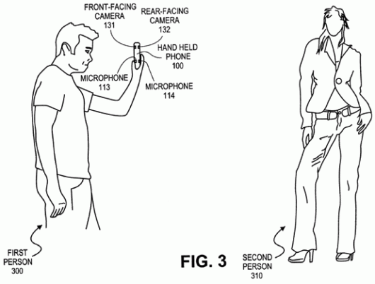 Il brevetto si chiama “Automatic Video Stream Selection” e descrive come iOS potrebbe switchare tra le due fotocamere rilevando i movimenti ed i suoni provenienti anteriormente o posteriormente tramite due microfoni e due videocamere. L’azienda spiega: