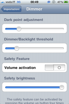 Una volta installato e configurato il tweak potrete continuare lo stesso slider nelle impostazioni del vostro telefono, o con SBSettings se installato. Dal 100% al 30% la luminosità sarà controllata dalla normale retroilluminazione del vostro iPhone, e sotto al 30%, la luminosità sarà controllata virtualmente dall’applicazione in questione.