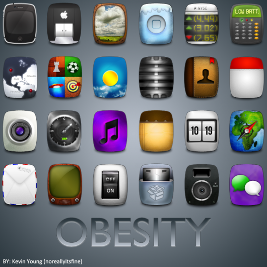 Questa settimana vi parliamo di Obesity, un bellissimo tema per la vostra Springboard composto da un set d’icone molto particolare. Tutte le icone infatti diventeranno “obese”, proprio come dice il nome del tema, allungate e più strette ai lati. Tutti i particolari sono veramente ben definiti e rispecchiano maggiormente nella versione HD per i dispositivi con Retina Display. Il tema è ovviamente disponibile sia in versione HD e SD. (Nota: gli elementi al di fuori delle icone dello screenshot in basso non sono inclusi nel tema)