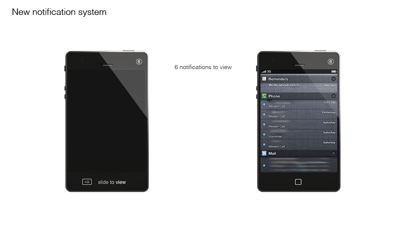 Marco, nel realizzare il suo concept di iPhone 5, ha introdotto due schermi touch amoled. Uno nella parte bassa che sostituisce il tasto fisico “Home” e sposta la barra di sbloccaggio dallo schermo alla parte esterna in modo da lasciar più spazio ai contenuti, l’altro nella parte alta nel lato opposto alla fotocamera frontale, che rende evidente la presenza e la quantità delle notifiche.