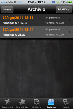 L’archivio tiene traccia di tutte le bollette che abbiamo salvato offrendoci un resoconto delle partite giocate, delle puntate e delle eventuali vincite. Qualora volessimo eliminare dati dall’archivio basterà strisciare verso destra sull’evento desiderato e cliccare elimina. In alternativa si può utilizzare il tasto Modifica in alto a destra.