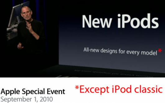 L’iPod Classic non è stato aggiornato lo scorso anno, anche se le slide della presentazione di Steve Jobs recitavano: “un nuovo design per tutti i modelli”. E’ ancora possibile acquistare gli iPod Classic, ma probabilmente se non sono stati aggiornati lo scorso anno, saranno lentamente accantonati. Sarebbe bello, ma alquanto improbabile, che fosse dotato di tecnologia wireless e di un Hard Disk esterno Wi-Fi, come succede per il Seagate GoFlex Satelite.