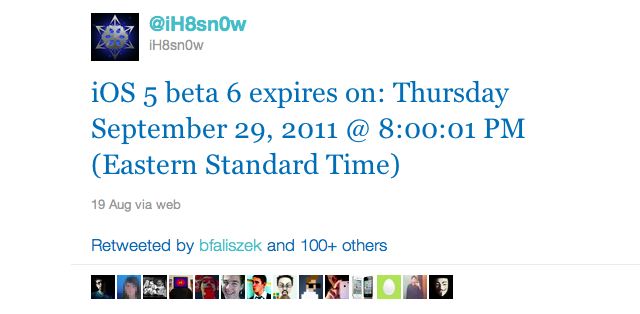 iH8snow informa con un tweet sulla sua pagina che la sesta beta di iOS5 scadrà il 29 Settembre, questa data offre qundi un’ipotesi più concreta sulla possibilità di vedere il nuovo firmware di Apple, unitamente con il prossimo telefono made in Cupertino, almeno per il mese di Ottobre.