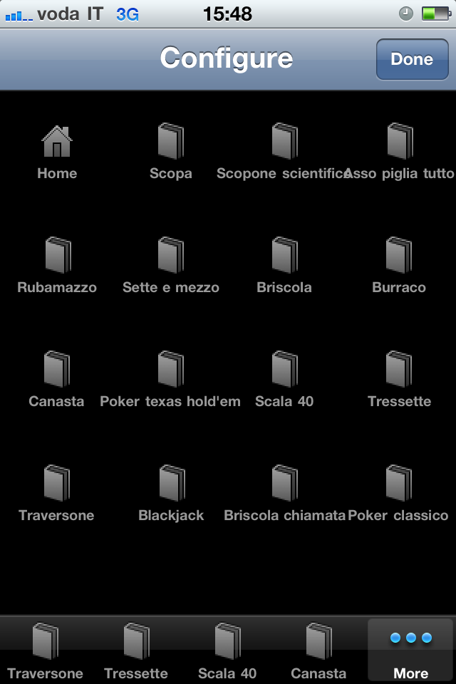 L’app è strutturata in 5 tab, quattro dei quali sono modificabili a piacimento, lasciando così la possibilità all’utente di personalizzare la schermata principale di Regolamenti di giochi di carte.