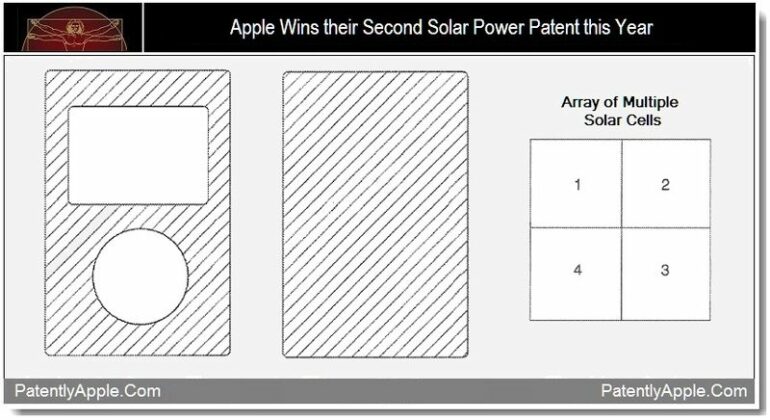 Le celle, per quello che si deduce dal brevetto, dovrebbero essere posizionato sotto la famosa wheel dei comandi dell’iPod. Questo è il secondo brevetto che viene concesso ad Apple relativo a questo tipo di energia pulita e sottolinea nuovamente che l’azienda di Cupertino avrebbe preso la definitiva decisione di puntare su questa nuova caratteristica per il futuro dei suoi dispositivi portatili.