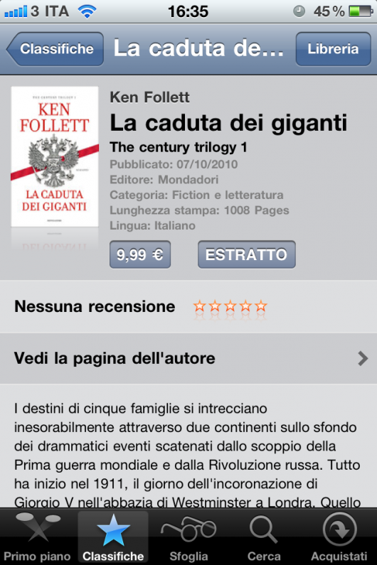 I prezzi sono molto ragionevoli, considerando che l’edizione con copertina rigida de La caduta dei giganti costa 25 € in libreria, mentre sullo store è venduto al prezzo di 9,99 €. Chi ama leggere con i dispositivi iOS troverà quindi grossi vantaggi economici acquistando le edizioni digitali dei propri libri preferiti.