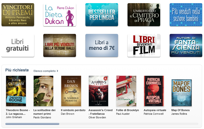 Non mancano le sezioni dedicate ai bambini, ad i classici della fantascienza ed ai libri da cui sono nati poi grandi film. Infine troviamo una sezione che contiene tutti i libri gratuiti, ed una che raccoglie i libri disponibili al download con un costo inferiore ai 7 euro.