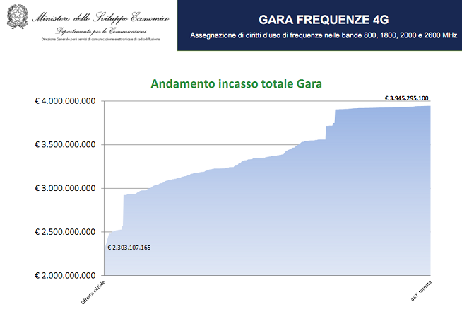L’incasso totale di 3.945.295.100 euro va ben oltre le aspettative dato che l’offerta iniziale era di circa 2,3 miliardi di euro. Come ha sostenuto il Ministro dello Sviluppo Economico Paolo Romani, “è un risultato straordinario che pone l’Italia in una posizione d’avanguardia rispetto all’Europa. In una situazione di mercato difficile, siamo riusciti ad attrarre una mole ingente di investimenti”.