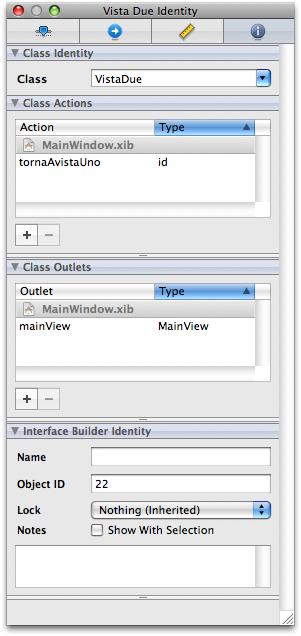 Abbiamo quasi concluso! Salviamo tutti i file (io consiglio sempre di eseguire un “Build”) e torniamo in Interface Builder, aprendo il file “MainWindow.xib”. Nel “Connections Inspector” della vista principale (la “MainView”) dovreste vedere l’ultimo elemento che non abbiamo ancora collegato, ovvero la “vistaDue”: