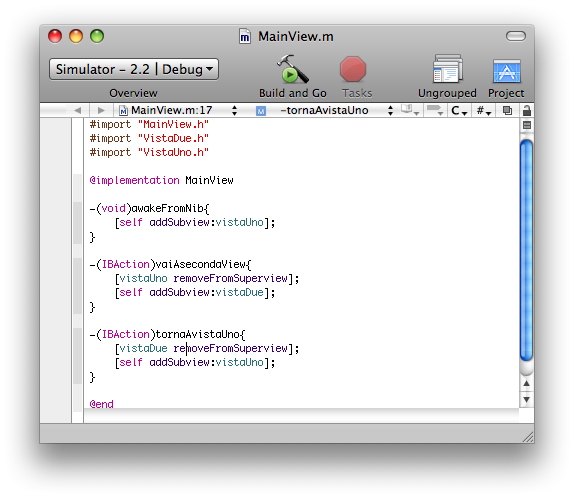 In questo passaggio abbiamo solamente completato l’intestazione.Dobbiamo, ora, implementare il metodo “vaiAsecondaView”. Il codice da inserire nel file “VistaUno.m” è il seguente: