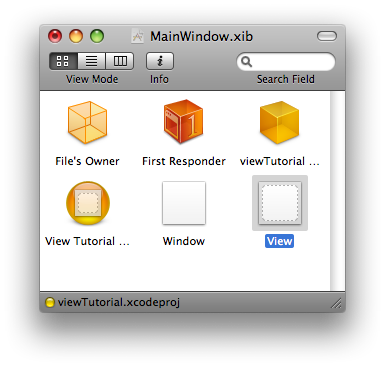 Questo metodo non fa altro che settare la “vistaUno” come “Subview”, ovvero come sotto-vista (ogni tanto XCode non è proprio intuitivo..). Abbiamo finito? Quasi! Ci manca ancora una piccola cosa. Dobbiamo collegare la “vistaUno”, che abbiamo appena dichiarato in “MainView”, con la vista effettiva che vogliamo che venga caricata. Questa operazione va eseguita, come sempre, in Interface Builder. Salviamo quindi tutti i file (io preferisco eseguire un “Build” per essere più sicuro) ed entriamo in Interface Builder, aprendo il file “MainWindow.xib”.