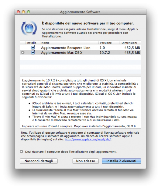L’aggiornamento 10.7.2 è consigliato a tutti gli utenti di OS X Lion e include correzioni generali al sistema operativo che migliorano la stabilità, la compatibilità e la sicurezza del Mac. Inoltre, include supporto per iCloud, un innovativo insieme di servizi cloud gratuiti che archivia automaticamente e in modalità wireless i tuoi contenuti su iCloud e li invia a tutti i tuoi dispositivi. iCloud di OS X Lion include le seguenti funzionalità: