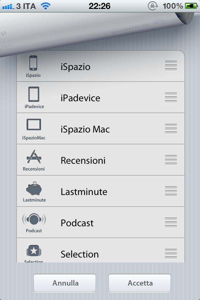 10. Personalizzazione completa delle icone: iSpazio Push App parte con un’organizzazione delle icone standard uguale per tutti ma attraverso le impostazioni potrete spostare le icone nell’ordine che preferite. Ad esempio potrete portare i Lastminute più in alto oppure la sezione “Post Salvati” a pagina 1, semplicemente spostando le etichette verso l’alto o il basso.