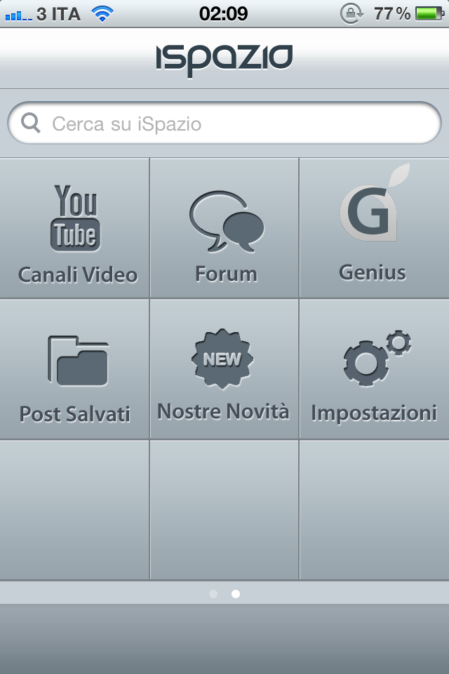 1. La grafica: Il primo grande cambiamento è puramente grafico ed organizzativo. La nuova iSpazio Push App è dotata di una grafica molto curata ed accattivante, pur mantenendo il consueto stile a 9 icone. E’ sviluppata su più pagine per cui, proprio come la SpringBoard dell’iOS, potrete trascinare la schermata principale verso destra e sinistra per muovervi tra le pagine.