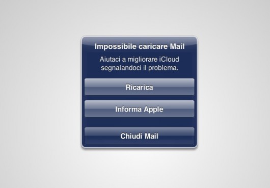 Ho quindi deciso di provare da web: niente da fare, la storia non cambia, con una schermata in stile iOS, Apple informa che ci sono problemi nel caricamento della posta ed invita a ricaricare, a mandare la segnalazione di errore oppure di chiudere la mail.