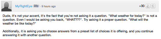 Nello specifico, si fa riferimento alla grammatica della frase “What weather for today”, che non è corretta, pertanto Siri non può capirla. Sarebbe stato più corretto chiedere “What will the weather be like today” oppure anche “What’s THE weather”. Ecco un paio di commenti degli utenti di 9To5Mac che lamentano la cattiva pronuncia/preparazione di colui che ha eseguito la prova: