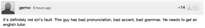 Nei commenti qui sopra, l’utente “MyRightEye” afferma che non è la pronuncia il problema, ma è proprio la grammatica e il modo in cui è stata posta la domanda. Anche “germo” pensa che non sia colpa di Siri, bensì della cattiva pronuncia, accento e grammatica di colui che ha girato il filmato.