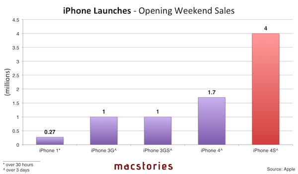 Dopo aver saputo tramite un comunicato stampa Apple che il numero di iPhone 4S venduti si aggira attorno ai 4 milioni di unità, è interessante vedere com’è cambiato durante gli anni il numero di iPhone venduti nel primo week end di vendita. Scopriamolo con un grafico.