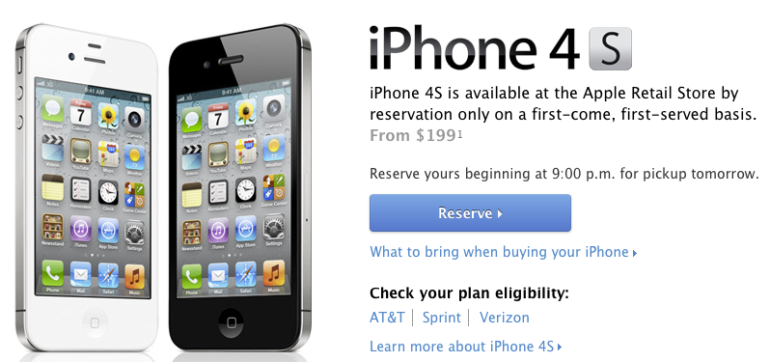 Ogni sera, dalle ore 21.00 a mezzanotte, coloro che vogliono acquistare un iPhone 4S possono accedere al sito apple.com, o attraverso l’applicazione per iOS, Apple Store, per controllare la disponibilità e prenotare il modello di iPhone 4S per il giorno lavorativo successivo. Terminata con successo l’operazione, la persona ha diritto a ritirare e pagare il terminale dalle ore 9.00 alle 18.00 del giorno successivo nell’Apple Store più vicino a casa sua.