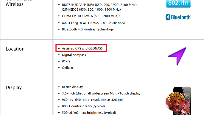 Nelle specifiche tecniche del sito americano apple.com, nella sezione Location compare la dicitura “Assisted GPS and GLONASS”. Nel sito italiano invece compare scritto solo “GPS assistito”, ma questo non esclude la possibilità che anche l’iPhone 4S italiano abbia il sistema di rilevamento della posizione GLONASS.