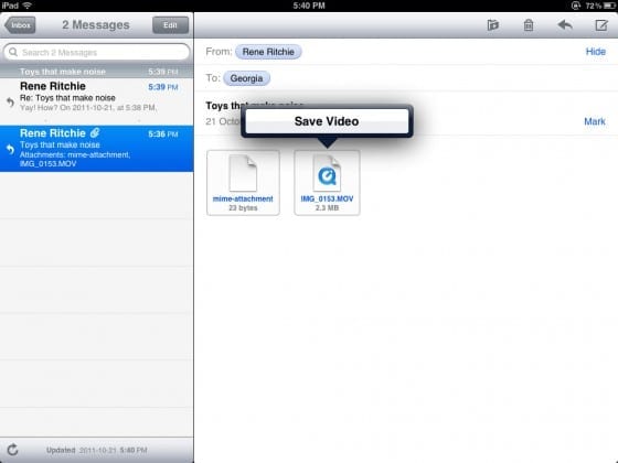 In precedenza alla ricezione di un video via Mail, potevamo o visionarlo ma non salvarlo sul nostro iDevice. Ora però potremo conservare il filmato nella nostra libreria esattamente come avviene con le immagini.