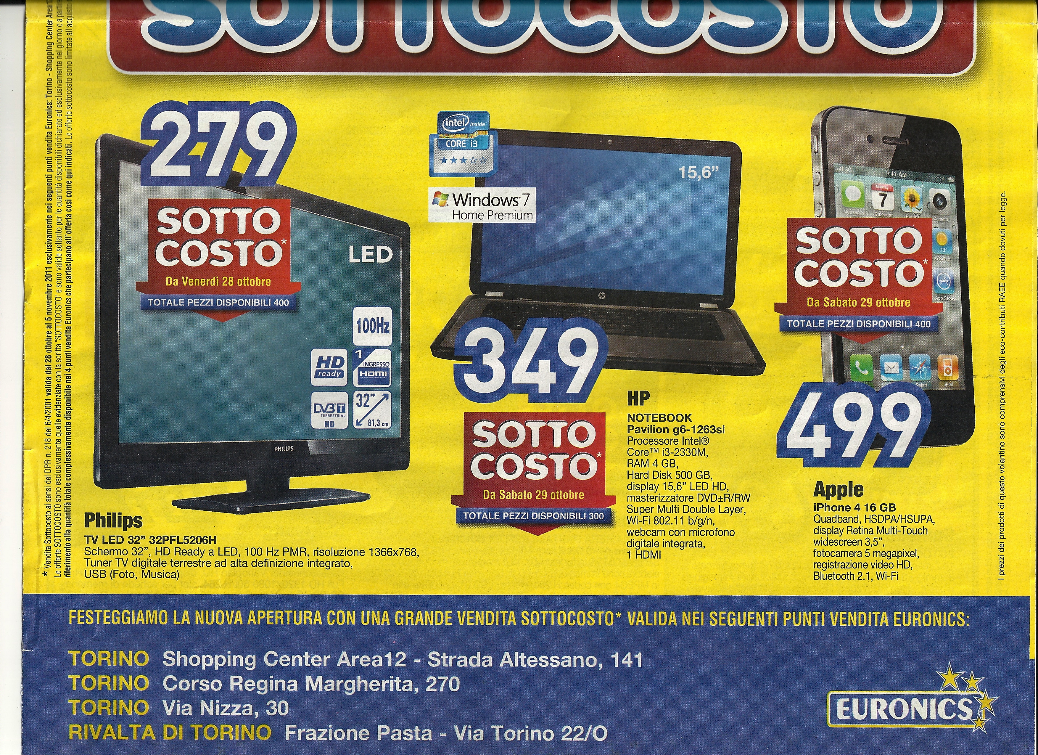 Nella giornata di ieri la nota catena di elettronica Euronics ha aperto un nuovo negozio a Torino e per celebrare l’evento, a partire da oggi fino al cinque novembre in quattro store del capoluogo piemontese ci saranno diversi sconti su vari prodotti, tra cui un’offerta sull’iPhone 4 16GB a partire dal 29 ottobre.