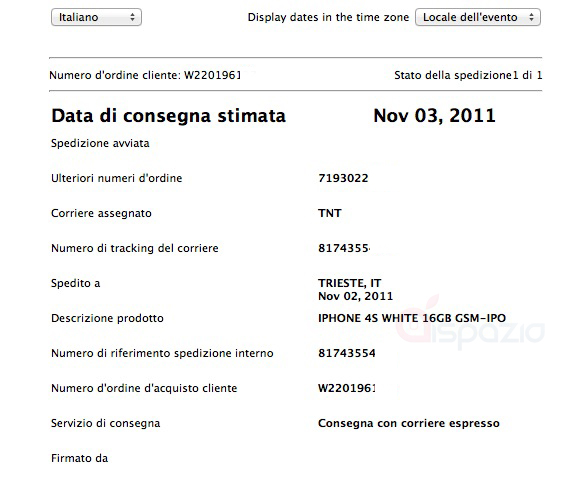 Come si può notare, il nostro utente Mario ci segnala che la Apple ha provveduto a spedire il suo iPhone 4S.
